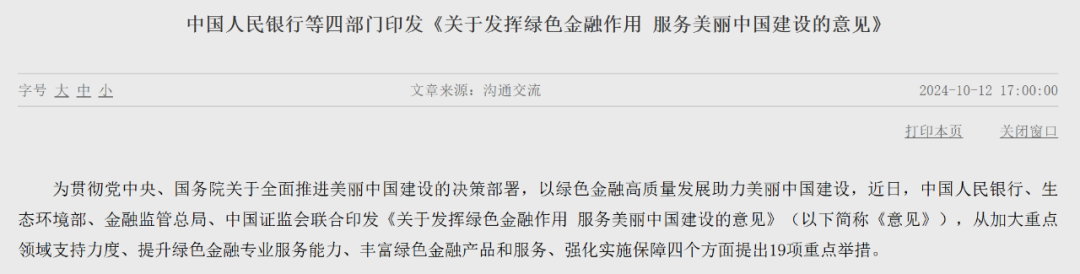 人民银行网站10月12日消息,为贯彻党中央、国务院关于全面推进美丽中国建设的决策部署,以绿色金融高质量发展助力美丽中国建设,近日,中国人民银行、生态环境部、金融监管总局、中国证监会联合印发《关于发挥绿色金融作用 服务美丽中国建设的意见》。